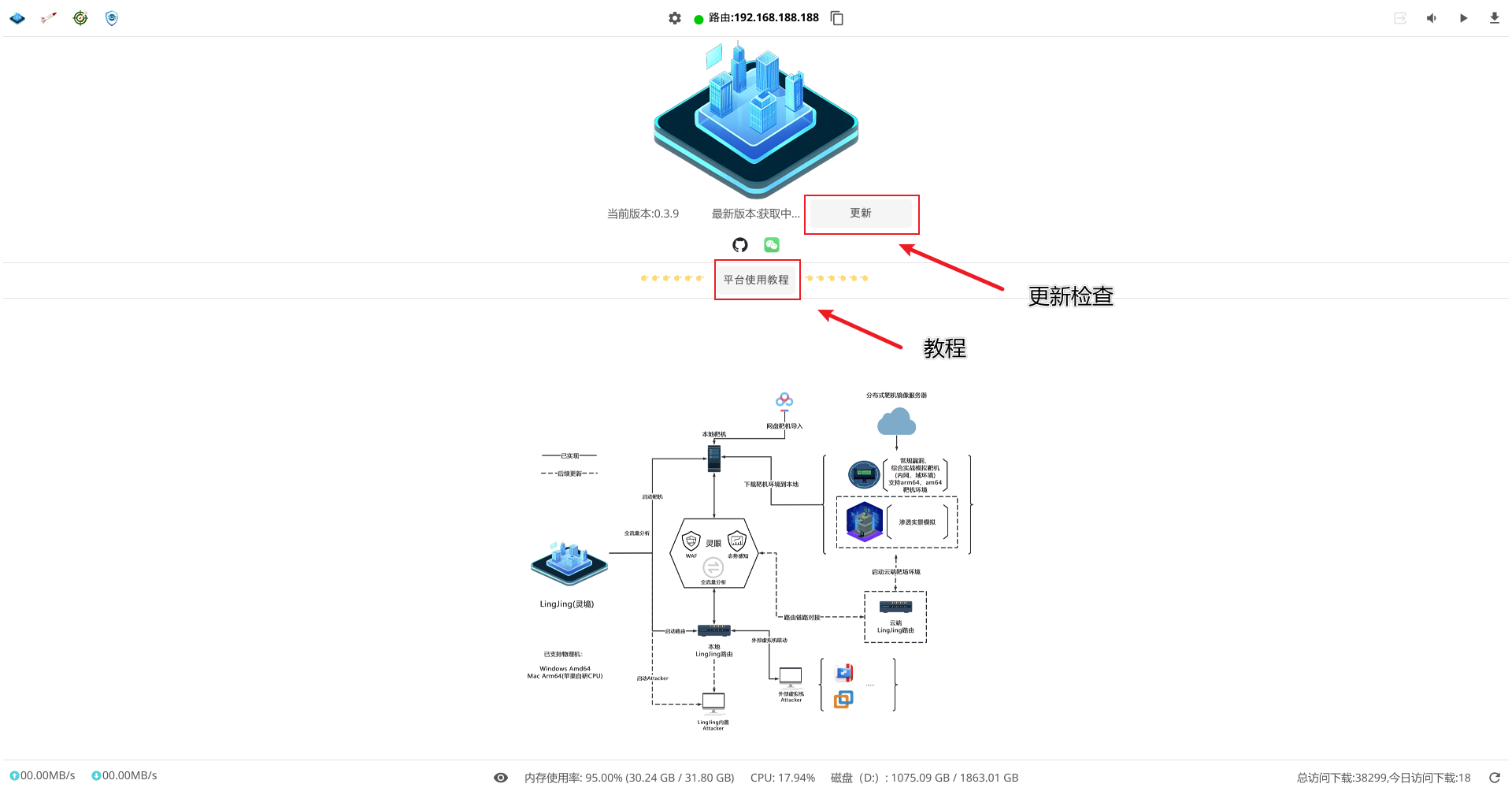 首页主要有更新检查、教程查看、和一个平台的拓扑示意图