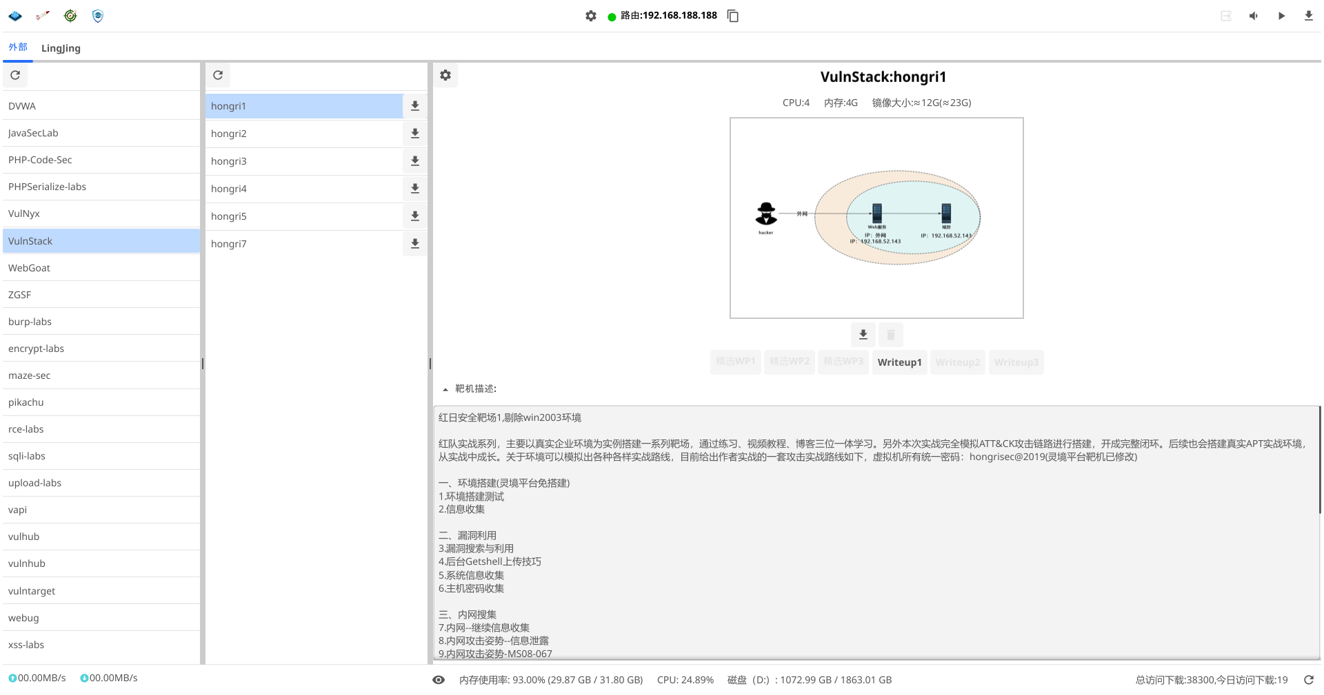 左侧的侧栏有两个,第一个是靶场项目的名称,第二个是具体的靶场,比如 VulnStack 红日靶场 系列,第一个靶场honri1。