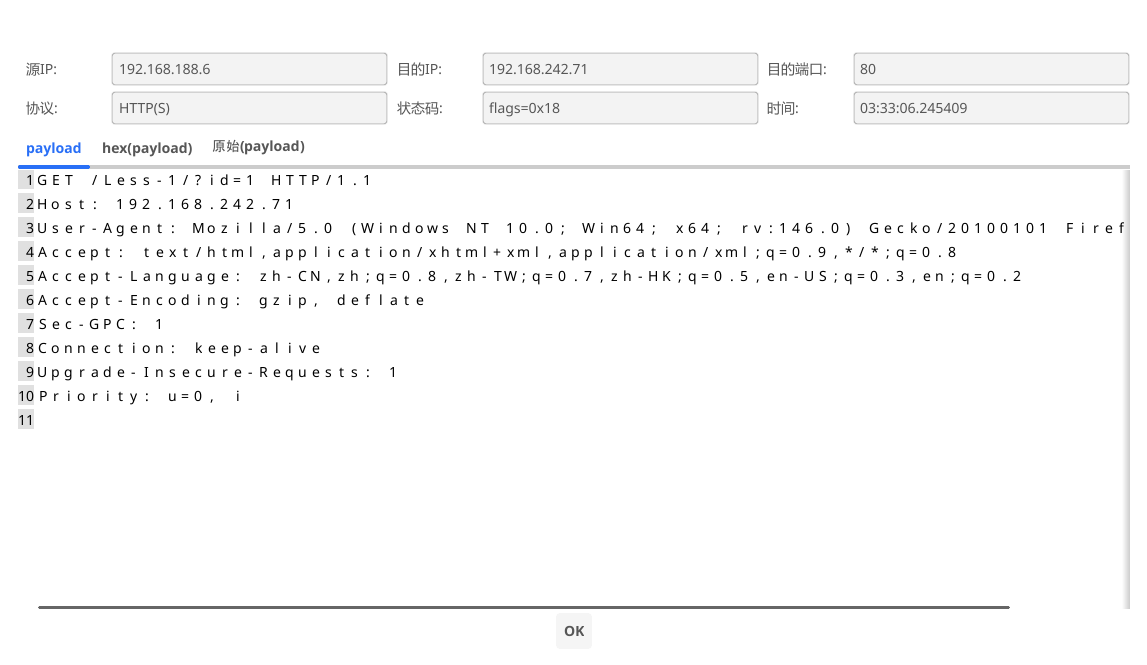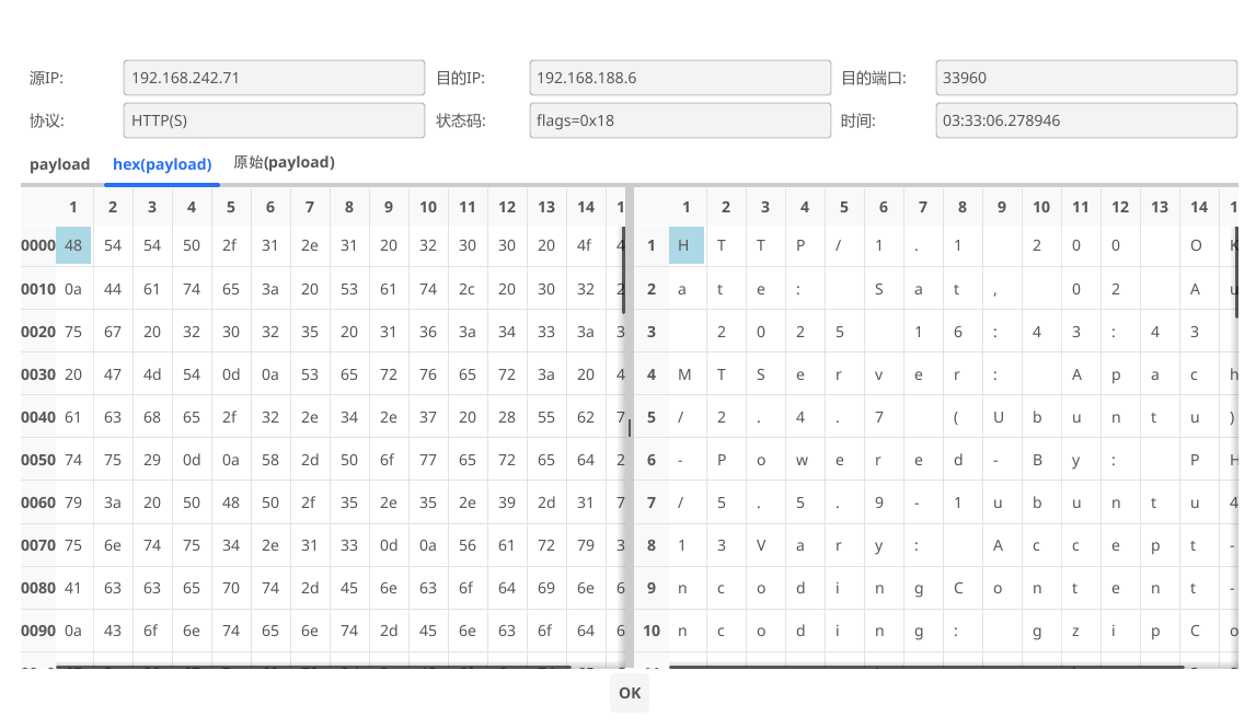 双击一条记录可以打开具体的数据包,可以看到可以看到具体内容,paylaod是正常看到的数据,hex(paylaod)和原始(payload)都有对应的16进制进行对照。